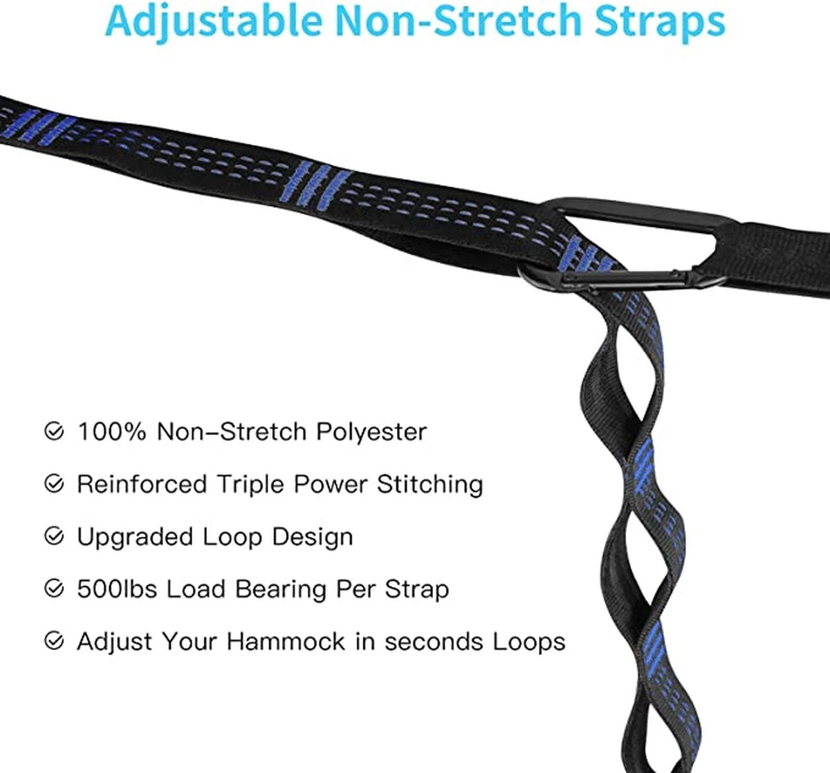 【DURABLE & HEAVY DUTY】De hangmat voor 2 personen is gemaakt van 210D nylon parachutestof en heeft een uitstekende rafeling, scheurvastheid en vuilbestendigheid. Verstelbare niet-rekbare riemen en stevige karabijnhaken kunnen maximaal 660 lbs ondersteunen.