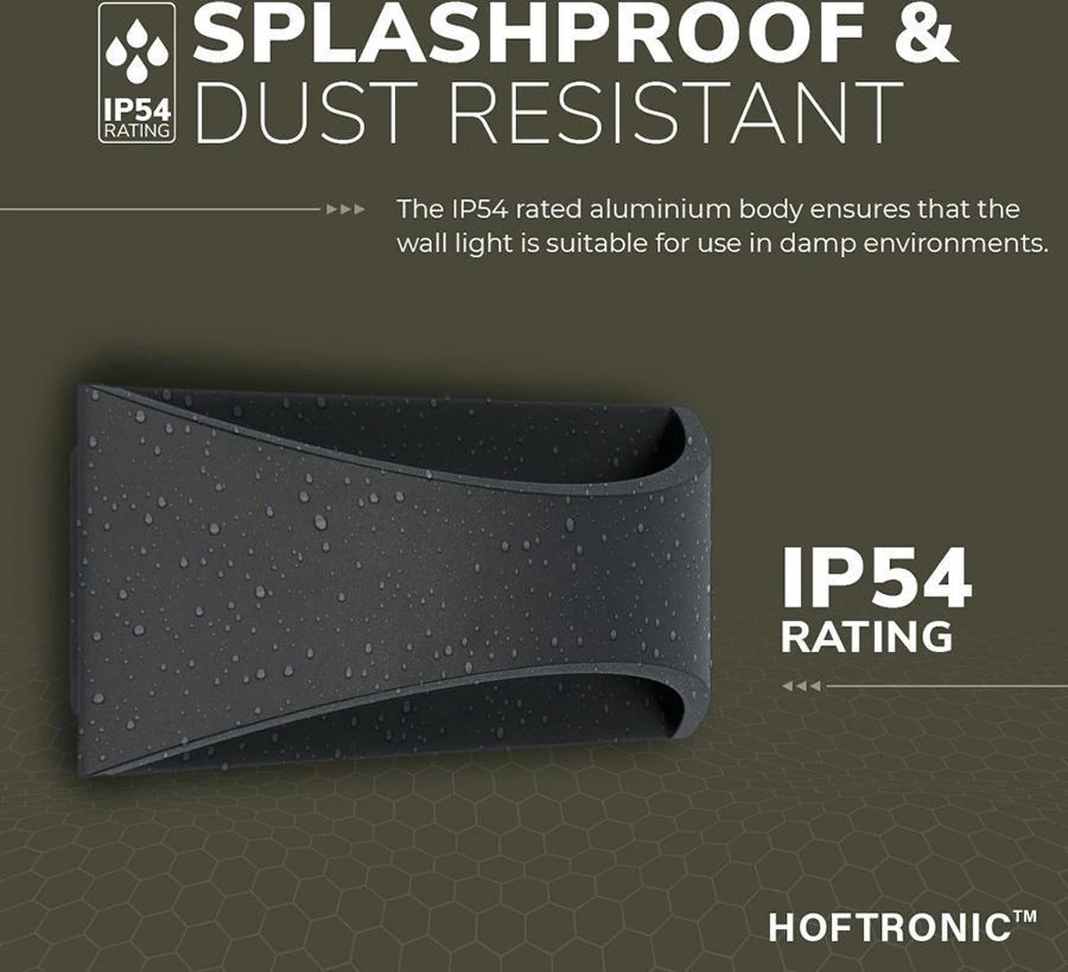 - AKZO-Nobel poedercoating: De Mat zwarte kleur heeft deze LED wandlamp te danken aan zijn vochtbestendige en UV-bestendige poedercoating. Hierdoor verkleurt de buitenwandlamp niet in de zon en bladdert de verf niet af bij langdurige blootstelling aan vocht.