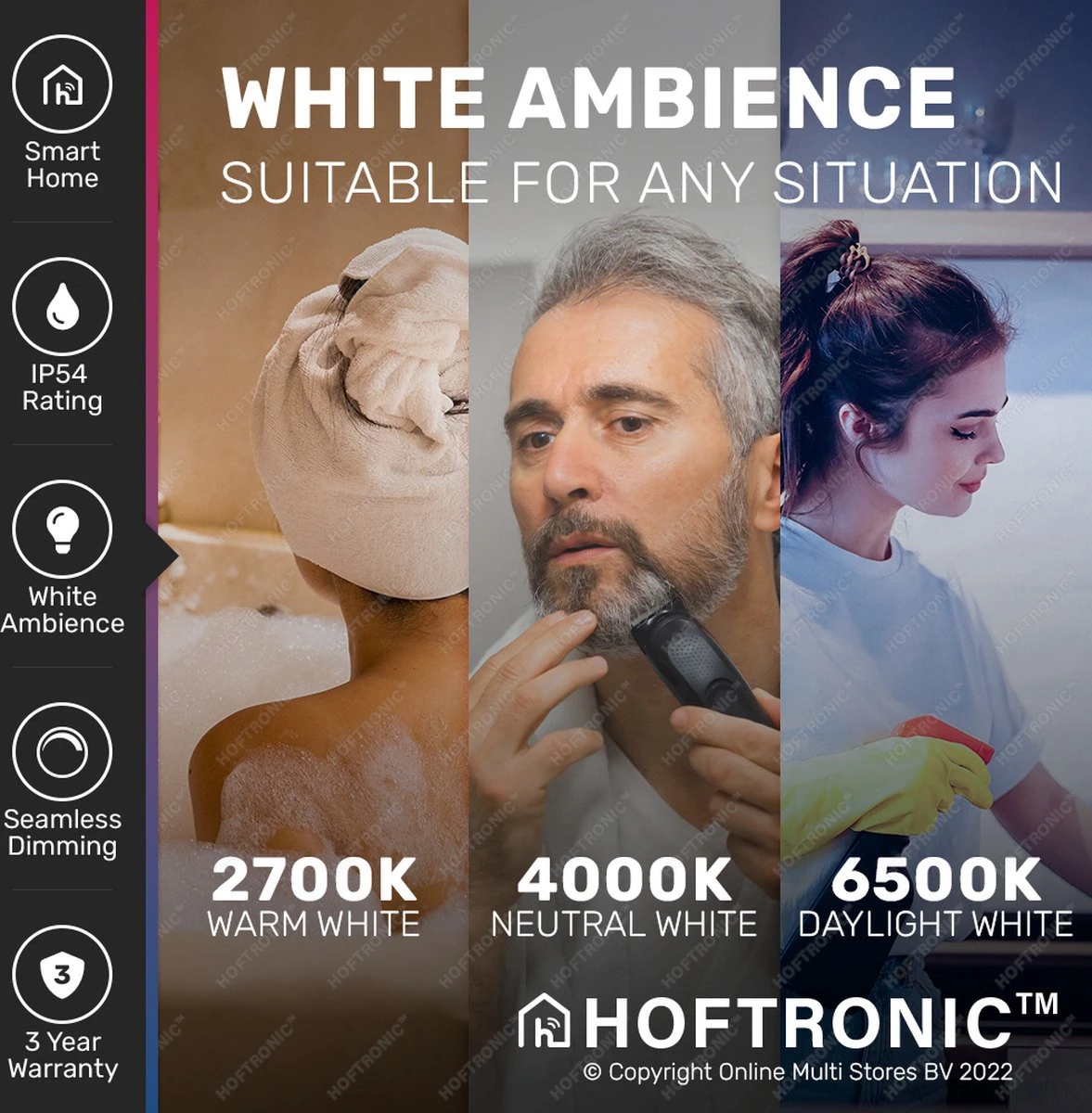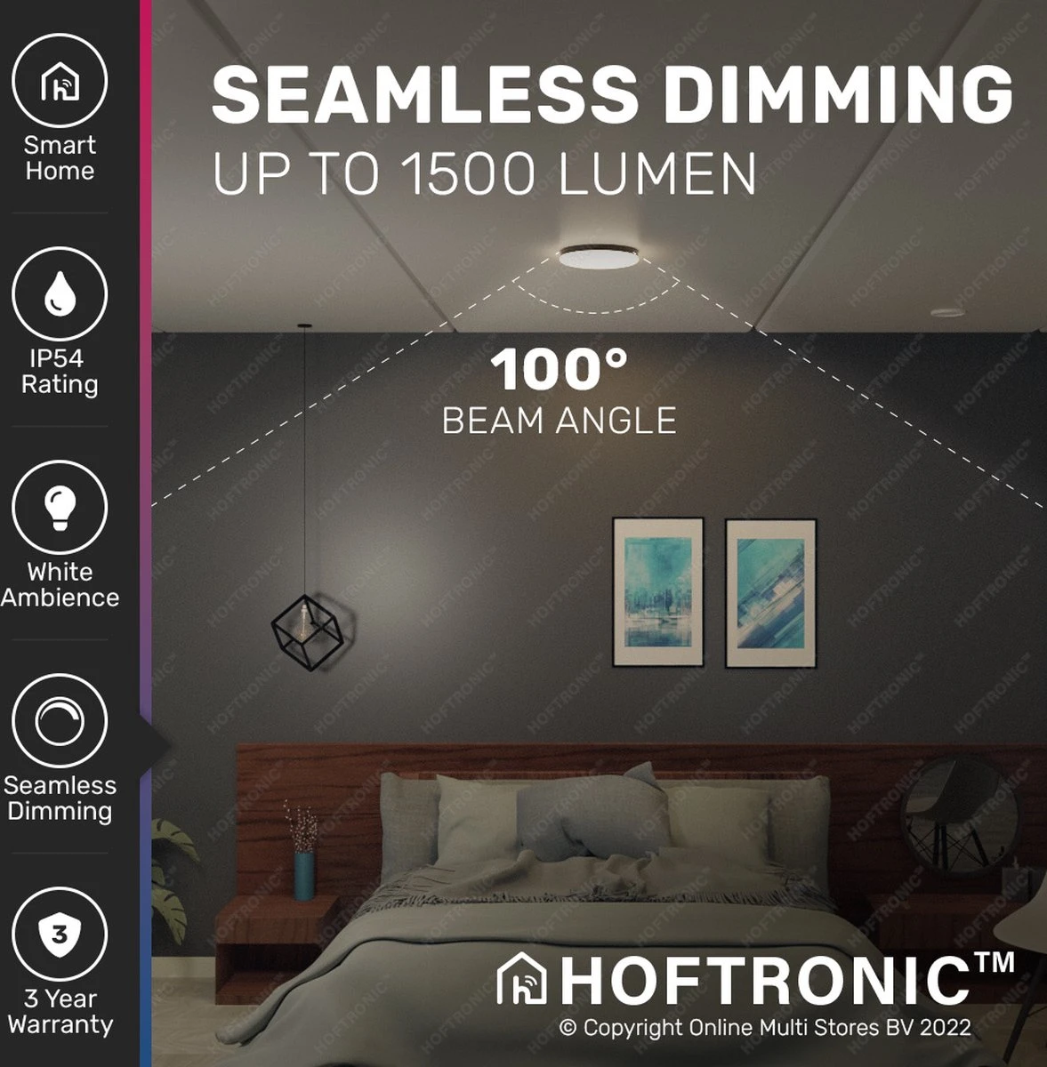 Deze handige slimme plafondlamp kun je door de white ambiance functie overal toepassen. Hierdoor kun je namelijk, via je smartphone. kiezen uit alle wit kleuren van 2700K – 6500K. Stel de lamp in op 2700K wanneer je lekker aan het relaxen bent in bad. 4000K neutraal wit kies je wanneer je voor de spiegel staat om je te scheren of om je make-up te doen en op 6400K wanneer je goed helder licht nodig hebt bij het schoonmaken. De lamp is volledig traploos dimbaar en op vol vermogen schijnt de plafondlamp met een lichtsterkte van 1500 lumen. Voldoende om iedere hoek van de badkamer (of andere ruimte) goed te verlichten. De Lumi beschikt over een IP54 beschermingsklasse. Defecten door vocht en stof zijn uitgesloten.