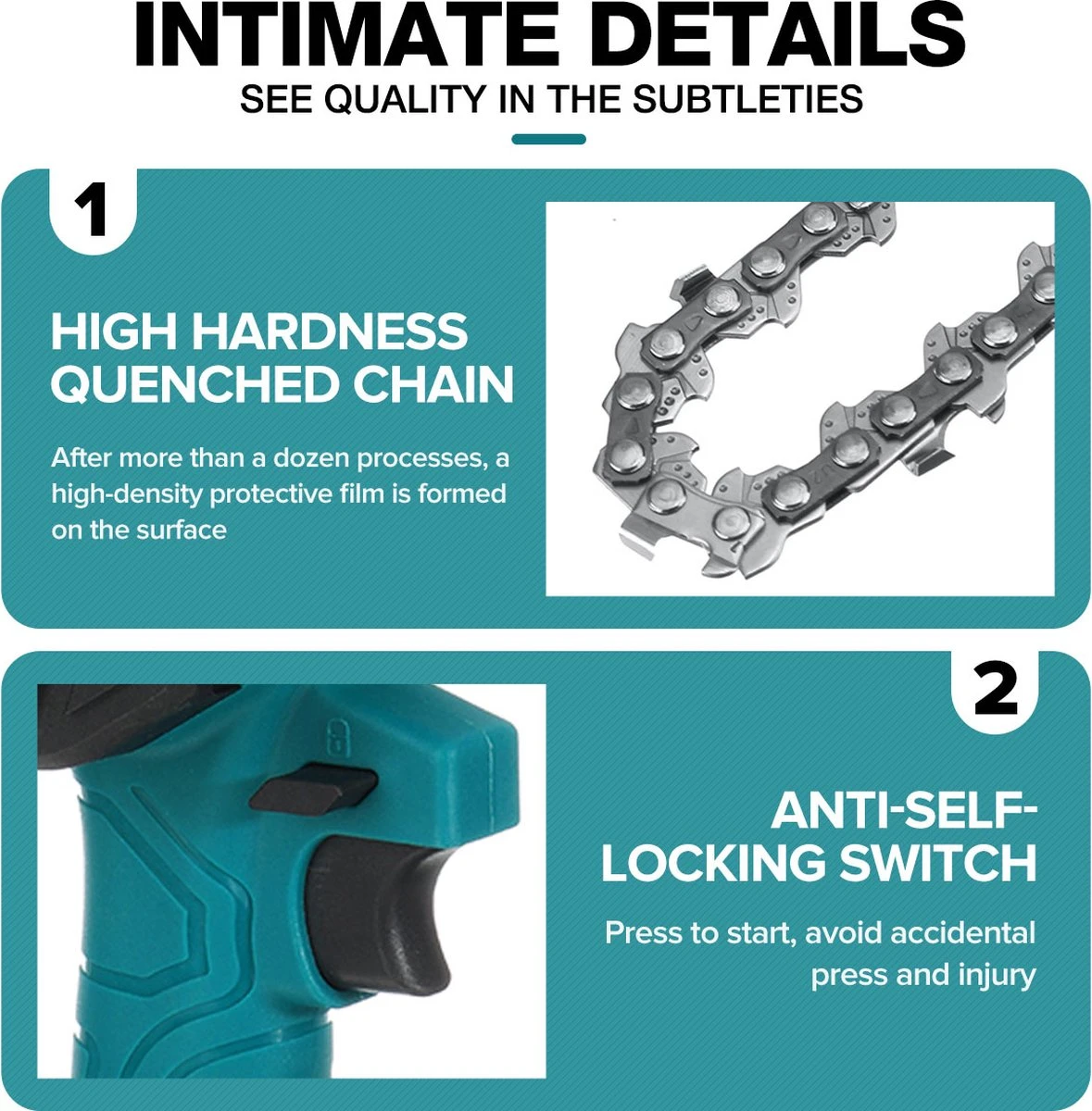 - l Oplaadbare elektrische kettingzaag, lichtgewicht en draagbaar, lange levensduur van de batterij en zal de schors niet beschadigen.