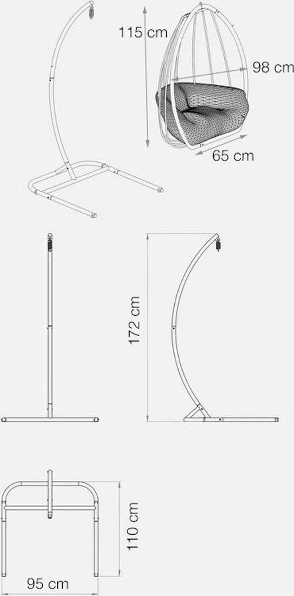 Het frame van de cocon is gemaakt van staal en ingewikkeld met rotan voor een stevige cocon en een draagkracht van 150 kg. De standaard is gemaakt van massief staal en heeft een dikte van 5 cm. De stalen poten komen met onderleggers, zo heb je ook bij oneven vloeren een balans. De onderleggers kun je zelf plaatsen waar je het nodig acht!