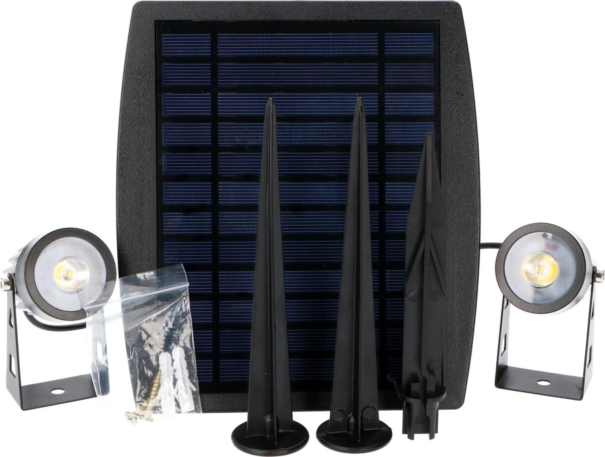 Verpakkingsinhoud: 2 x Proventa LongLife zonnepaneel + 4 x LED Grondspots + 6 grondpinnen + Handleiding