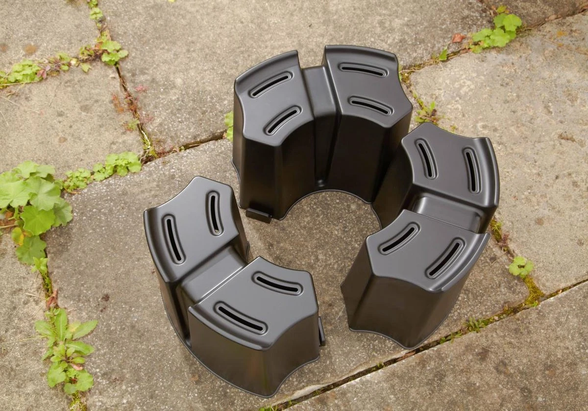 Regenton voet die verstelbaar is voor de Harcostar en andere regentonnen. De drie delen passen in elkaar, maar ze kunnen bij grotere tonnen ook afzonderlijk van elkaar geplaatst worden. Door het gewicht van de regenton blijven de delen dan op zijn plaats