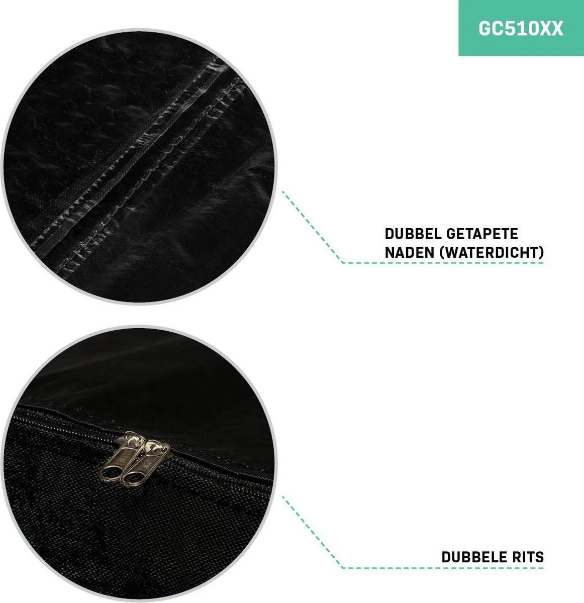 - De stof is waterdicht. Alle naden en hoeken zijn voorzien van een beschermende tape om dit te garanderen. Echter: de rits kan altijd water doorlaten. Daarom zijn deze opbergtassen bij de rits niet waterdicht en wij raden aan om de tas in de schuur, de berging of op zolder op te slaan. En dus niet permanent buiten.