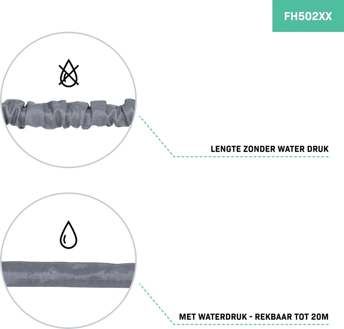 - De flexibele tuinslang heeft een minimale lengte van 6,7 meter, maar is tot drie keer uittrekbaar waardoor je een lengte van wel 20 meter behaald.