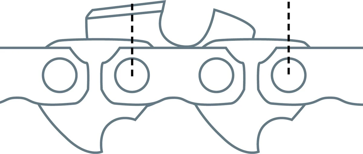 stap3: Meet de afstand van de klinknagel van de zaagschakel naar de tweede klinknagel van de schakel rechts hiervan. Je kan ook de afstand meten tussen klinknagel 1 en 3 en dan op het hart van de klinknagel. Zie voorbeeld afbeelding. (de keuzes zijn 12,7mm= 1/4″ / 16,5mm= 325″ / 18,64mm= 3/8″ / 20,52mm= 404″) (voor deze ketting 18,64mm= 3/8″)